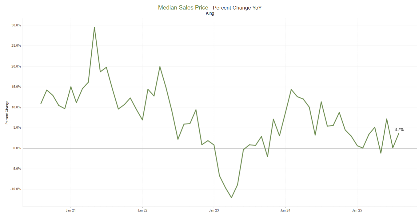 In August, both active listings and home sales declined compared to July—by 2.7% and 7.7%, respectively—across the 27 counties in the NWMLS coverage area. This slowdown was largely driven by weaker activity in King and Snohomish counties. Compared to the same time last year, listings rose by 30.8%, but sales fell by 5.7%, indicating continued stagnant buyer demand. Median home prices remained flat month-over-month and increased just .8% year-over-year.