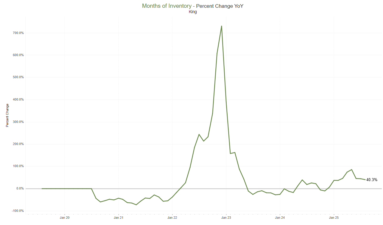 . The six counties with highest year-over-year increases in active inventory for sale were Ferry (+63%), Snohomish (+50.1%), Jefferson (+47.3%), Clallam (+46.3%), Columbia (+45.8%), and Thurston (+38.9%).